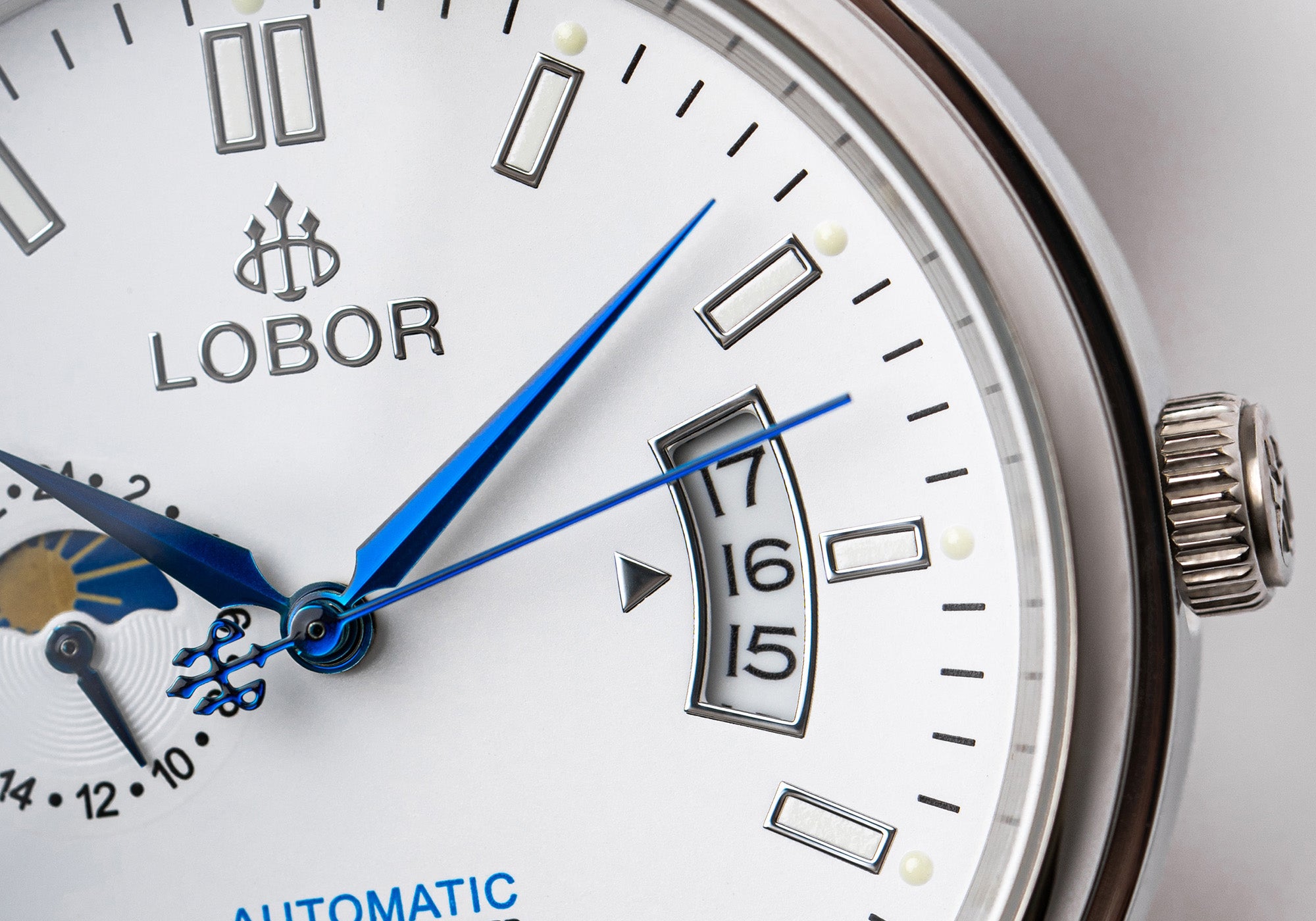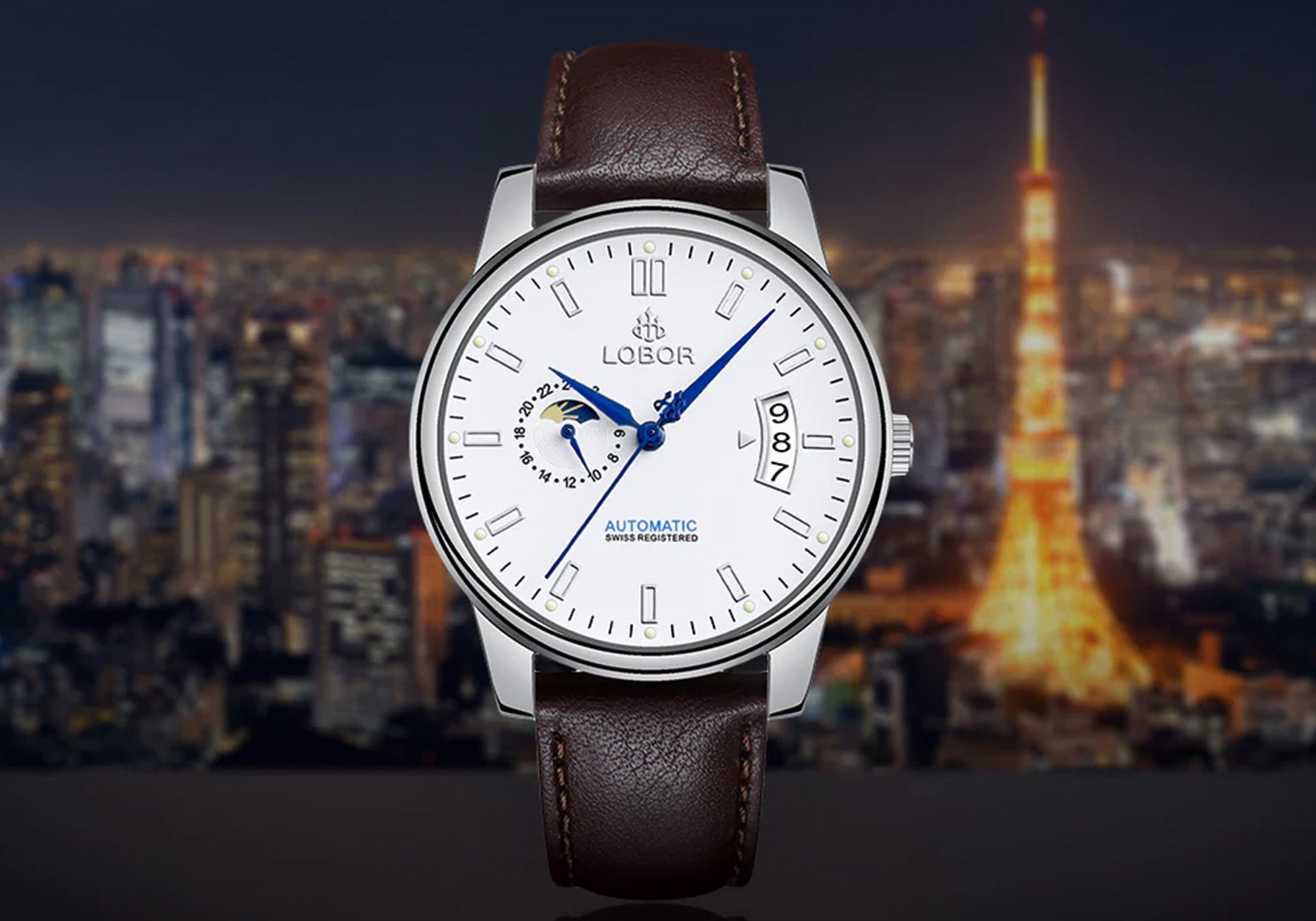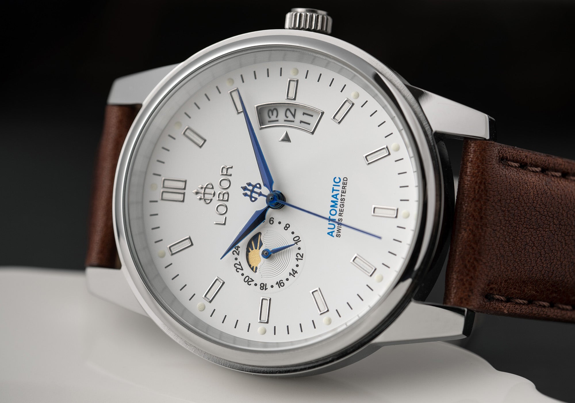 The Belfry features a 24-hour display and moonphase, with a curved date window and luminous accents for easy reading. Its layered dial blends functionality with refined elegance, perfect for daily wear or formal occasions.