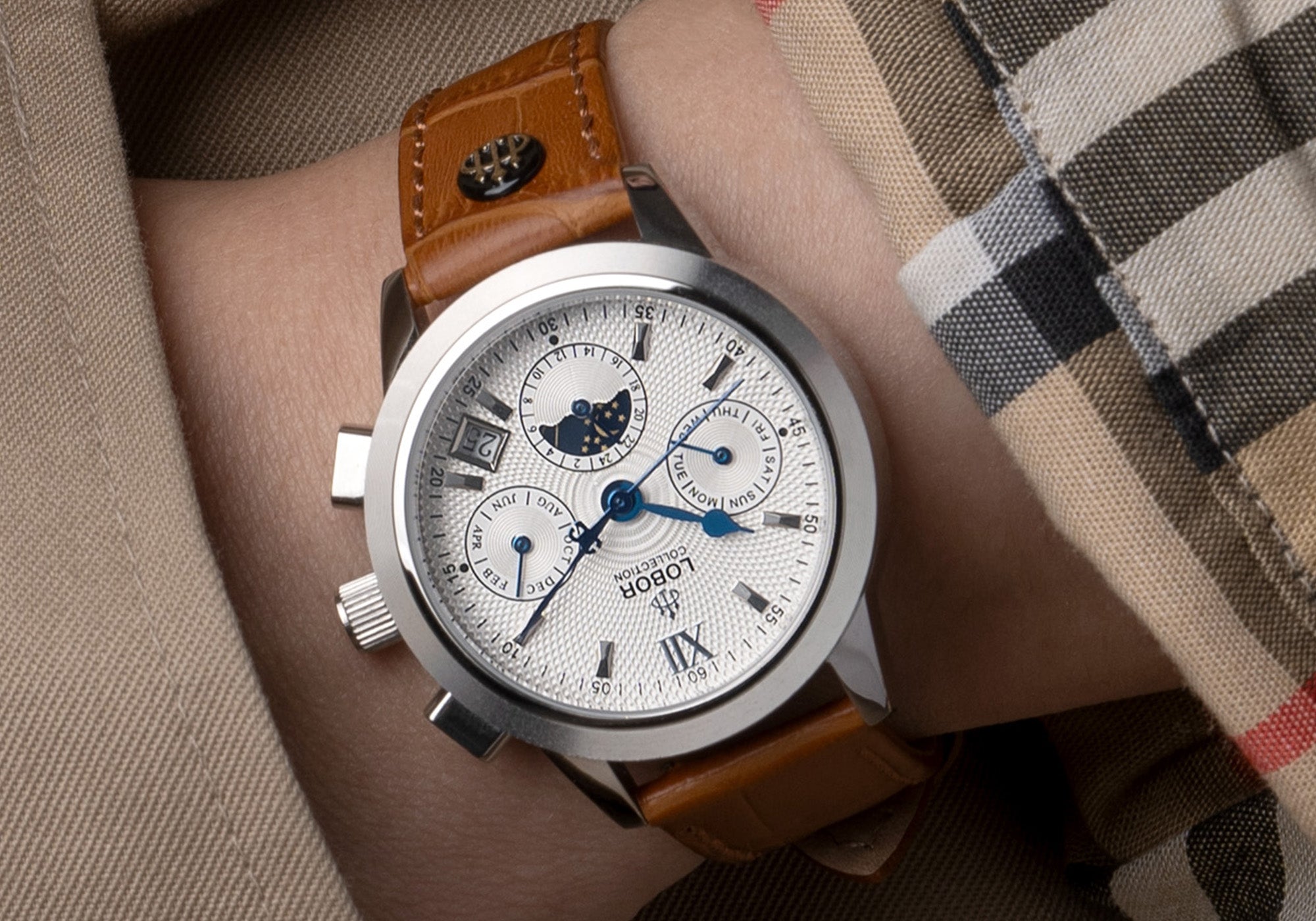 This automatic watch pairs a premium movement with meticulous craftsmanship. Its tri-compax dial features day, month, and 24-hour indicators, a vintage-style moonphase, and a subtle mini date window, combining practical functionality with elegant design.