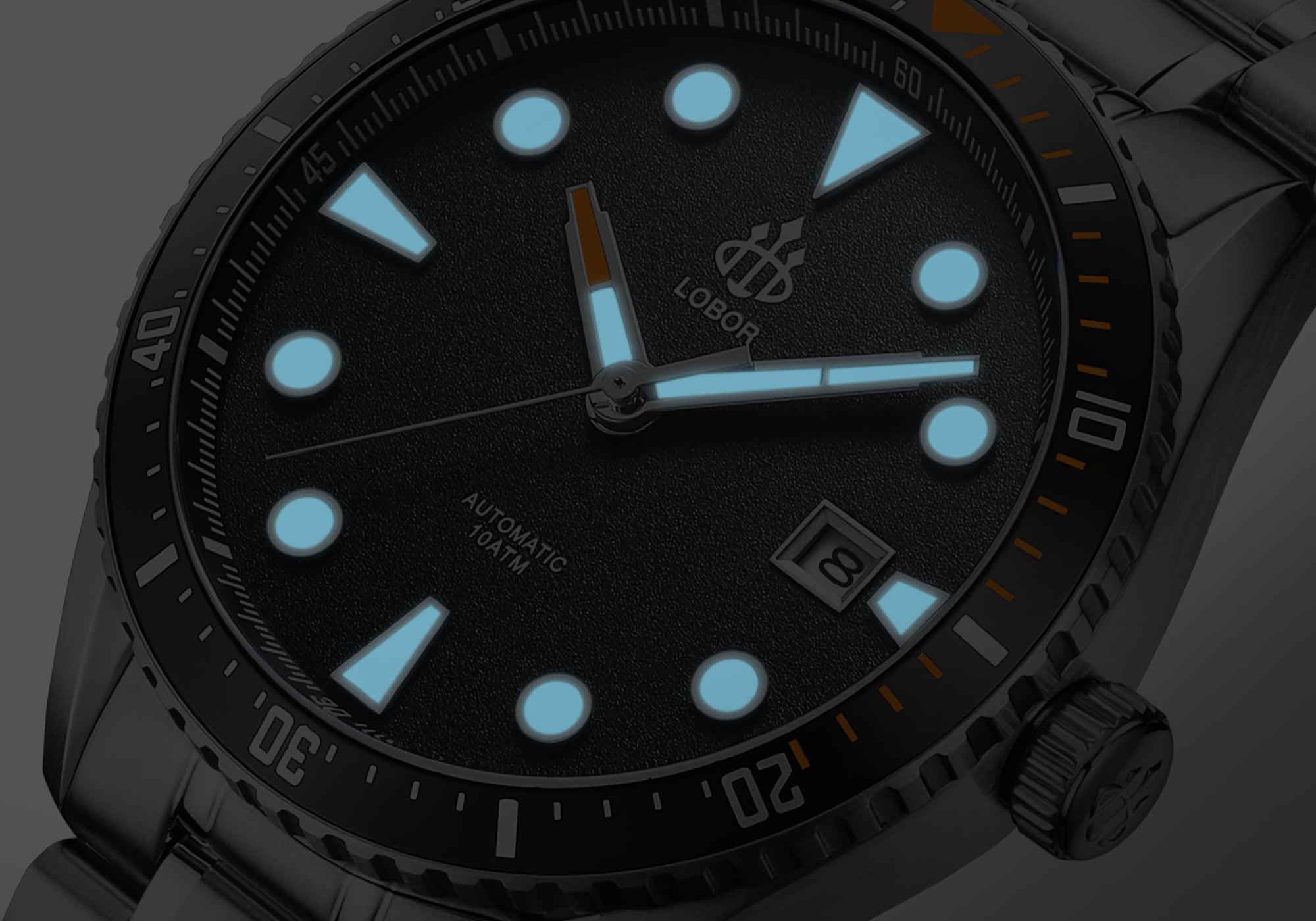 The dial features a sunburst pattern with geometric markers and hands coated in Super-LumiNova blue lume. An inner-minute track ensures easy readability even in complete darkness, blending functionality with style.