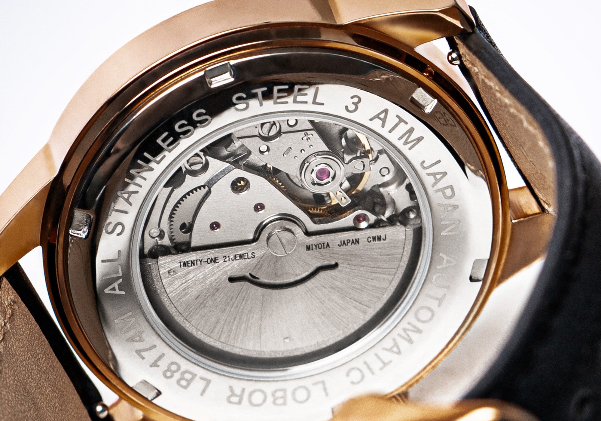 The transparent caseback showcases the intricate workings of the automatic movement, combining precise craftsmanship with elegant design for both visual appeal and functional appreciation.