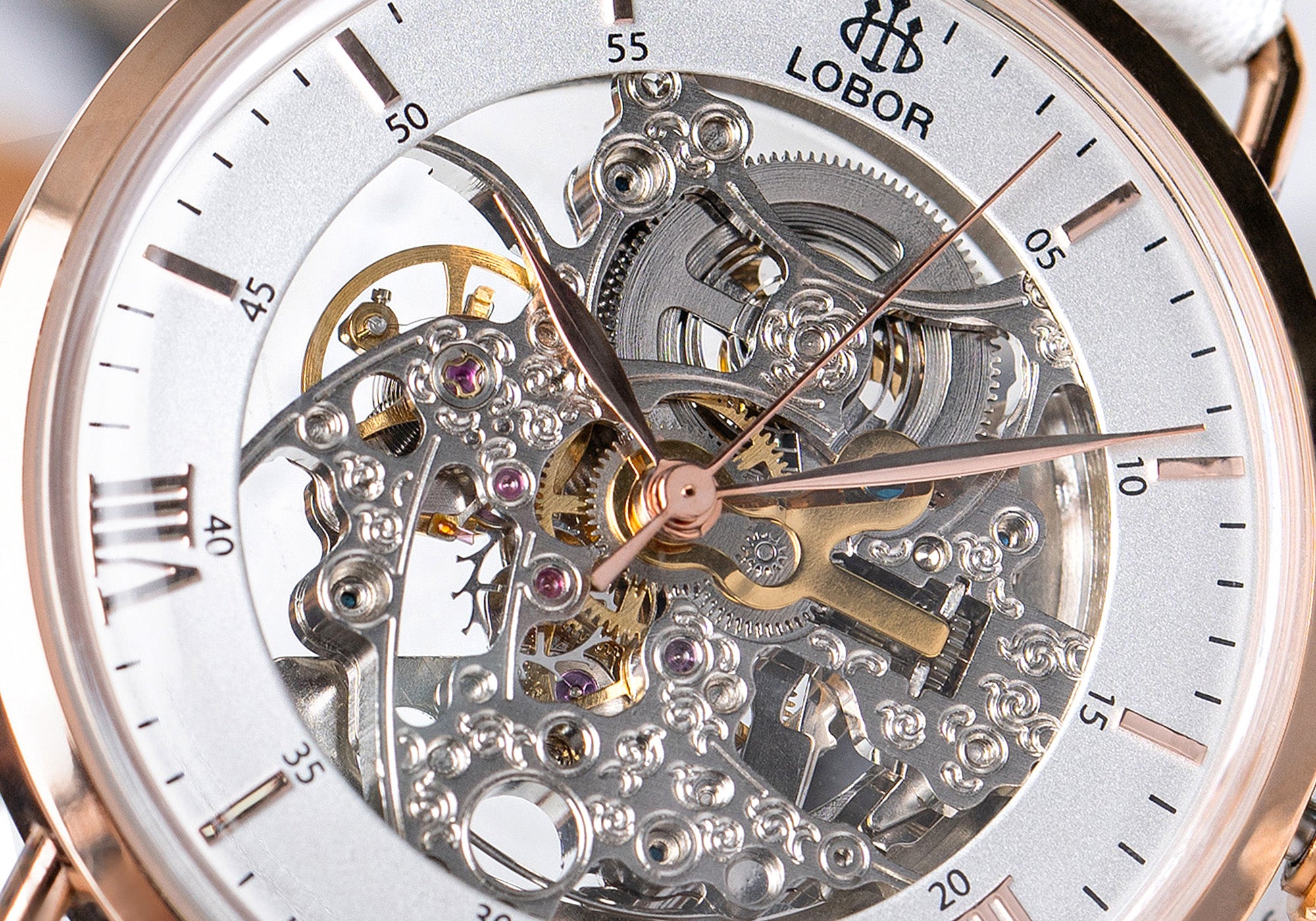 The skeletonized movement highlights precise craftsmanship, with jeweled details adding a subtle sparkle visible through the transparent dial.